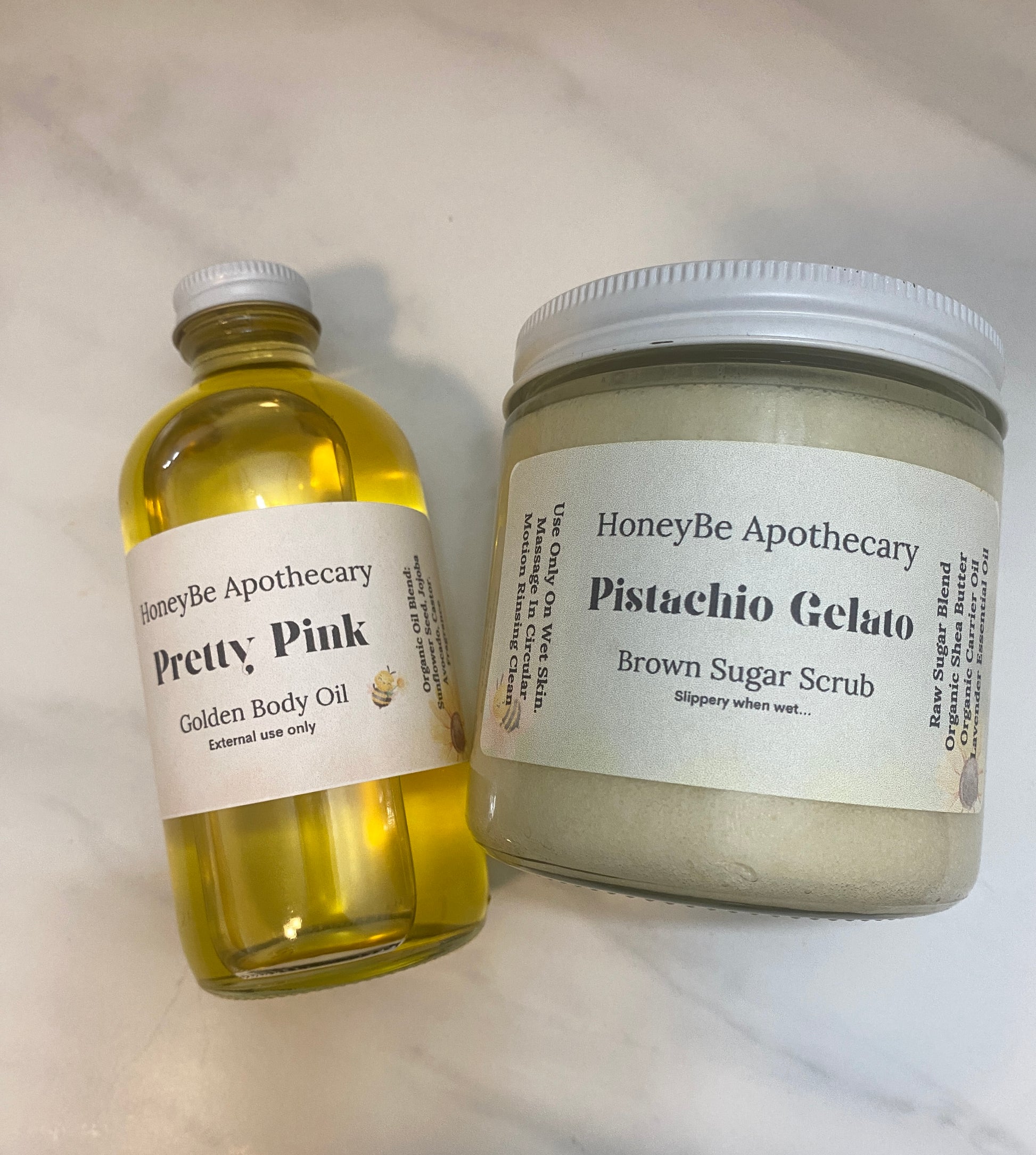 Bigger is Better! Pairing our 8oz Golden Body Oil with our 16oz Brown Sugar Scrub is going to deliver the softest smoothest skin you've had in a long time. Truly gentle exfoliation meets lightweight moisturization. This jumbo combo should last a while...unless you use more and trust, you'll want to.